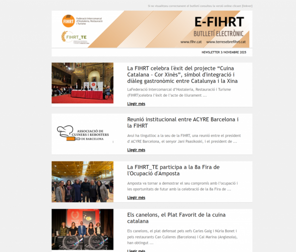Aquesta tercera edició de l’E-FIHRT de novembre 2025 recull una àmplia activitat institucional, gastronòmica i turística arreu del país, tot mostrant el paper central de la FIHRT i dels gremis territorials en l’impuls del sector. S’hi destaca l’èxit del projecte “Cuina Catalana – Cor Xinès”, exemple d’integració i diplomàcia gastronòmica; les reunions institucionals amb ACYRE Barcelona; i la presència activa de la FIHRT_Terres de l’Ebre a la Fira de l’Ocupació d’Amposta.