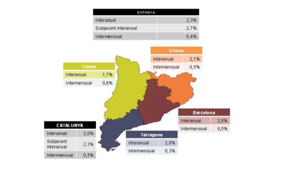 En termes de variació interanual, l’increment a Catalunya continua per sota del d’Espanya (2,0% i 2,3%, respectivament). La inflació subjacent se situa a Catalunya quatre dècimes per sota la que registra Espanya (2,3% i 2,7%, respectivament).