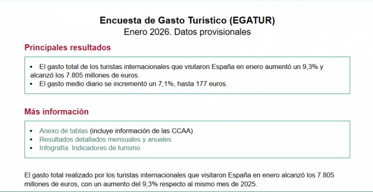 La despesa total dels turistes internacionals el primer mes de l’any 2026 ascendeix a 7.800 milions d’euros, un 9,3% més que al gener de l’any anterior, segons les dades que publica l’Institut Nacional d’Estadística (INE).
