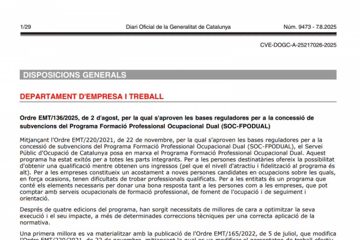 Ordre EMT/136/2025, de 2 d’agost, per la qual s’aproven les bases reguladores per a la concessió de subvencions del Programa Formació Professional Ocupacional Dual (SOC-FPODUAL).